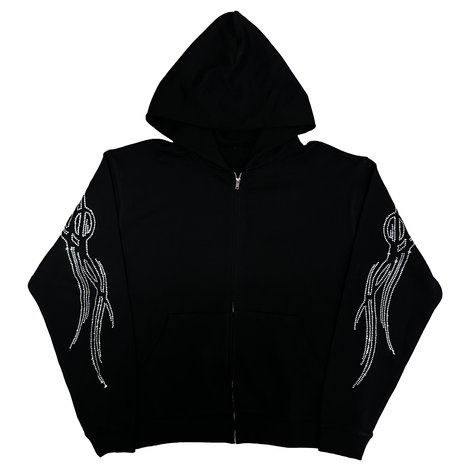 Rhinestone 'ONYX' zip up hoodie. Covered in rhinestones from sleeve to sleeve. True to sizing. Manufactured in Los Angeles.